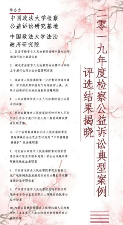 2020年7月18日,中国政法大学检察公益诉讼研究基地举办了2019年度检察公益诉讼典型案例发布会,我院支持东莞市环境科学学会向袁某某等三人提起的污染环境民事公益诉讼案被评为十大典型案例。本次案例评选活动由中国政法大学检察公益诉讼基地与中国政法大学法治政府研究所举办,目的是推动检察公益诉讼制度的理论完善,加强理论界与实务界对话交流。主办方邀请了最高人民法院、最高人民检察院、中国人民大学、北京大学、清华大学、国家检察官学院、中共北京市委党校、《法学》杂志社《国家检察官学院学报》杂志社等高校、科研机构及杂志社的三十八位专家学者历时三个月,对征集案例进行了三轮评估,最终评选出10件典型案例、10件优秀案例。我院办理的支持东莞市环境科学学会起诉案位列十大典型案例之一,也是广东省唯一入选的典型案件。